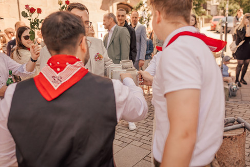 Nach der Kirche wartete draußen eine besondere Überraschung: zahlreiche Vereine hatten sich aufgestellt, um Spalier zu stehen. Mit Fahnen, Glückwünschen und vielen fröhlichen Gesichtern begleiteten sie das Brautpaar aus der Kirche hinaus. Ein Zeichen der Gemeinschaft und der Freude, das den Tag noch unvergesslicher machte.